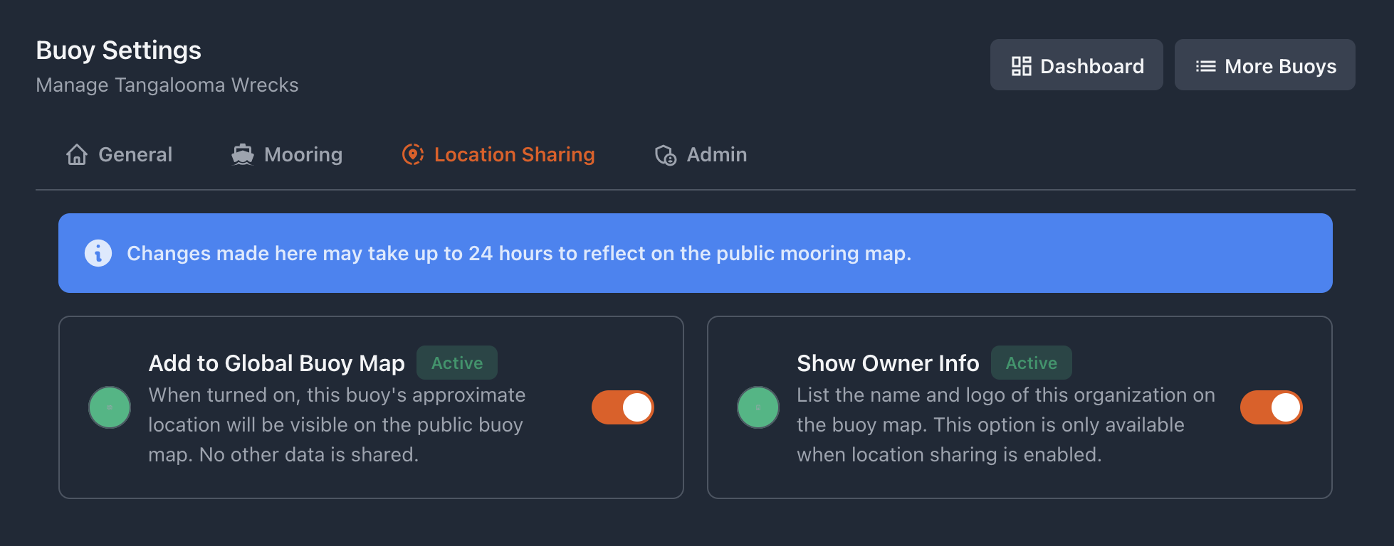 We are working on a feature that shows your organization's logo and name next to the buoy on our Global Mooring Map. When you enable this setting, you consent to us showing this information publicly. If the *Add to Global Buoy Map* option is disabled, this setting does not apply.