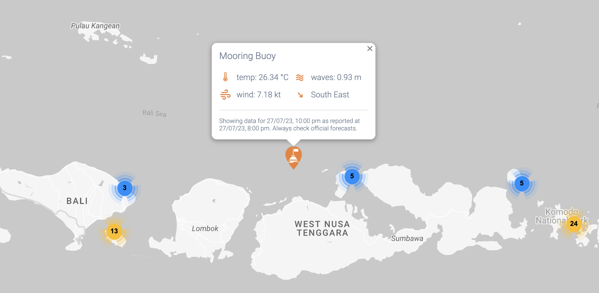 Our Global Mooring Map shows the public a marker at the buoy's location and a generic name along with basic satellite weather data for the current time period. Your sensor data is not shown.